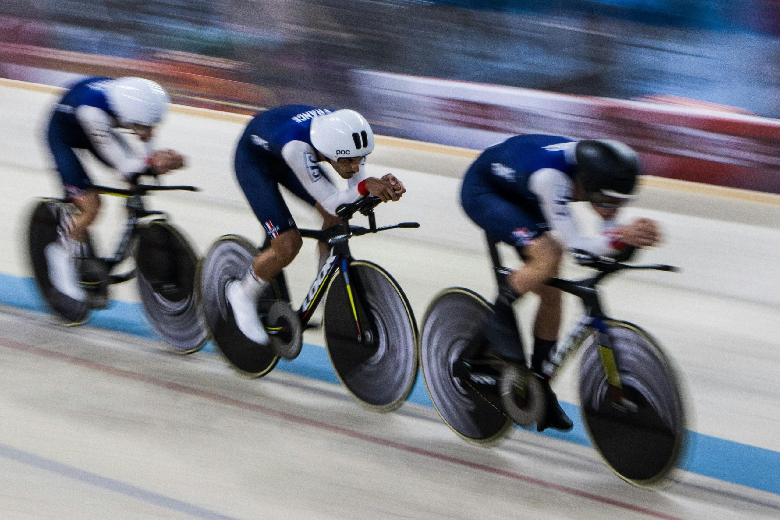 Velocidad por equipos: Dos equipos de tres ciclistas recorren tres vueltas. Los dos equipos empiezan con los tres ciclistas. Cada miembro se va turnando para ir a la delantera durante una vuelta. Uno a uno, van abandonando la pista hasta que solo queda un miembro del equipo. Los corredores no pueden abandonar su vuelta hasta que esté completa al 100%. En las rondas clasificatorias se deciden los equipos siendo cronometrados, y en las eliminatorias compiten dos equipos.
